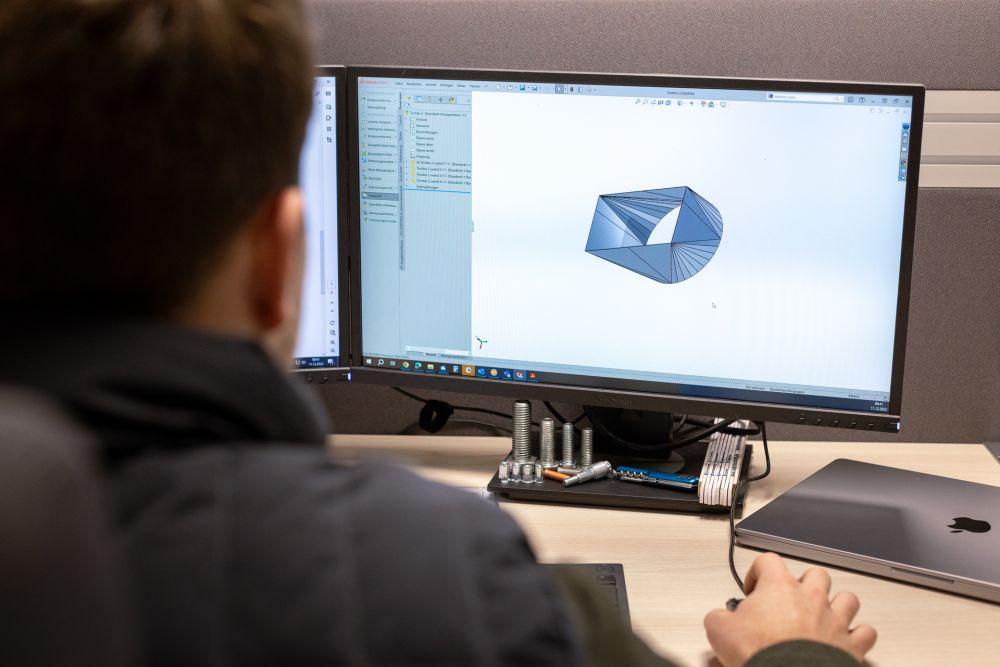 Während Deiner Ausbildung zum technischen Produktdesigner bekommst Du zuallererst einen Einblick in unsere komplette Fertigung. Dabei lernst Du die nötigen praktischen Kenntnisse über den Fertigungsprozess kennen. An Deinem eigenen Büro-Arbeitsplatz in der Konstruktion und Arbeitsvorbereitung bekommst Du dann beigebracht, wie zum Beispiel 3-D Modelle erstellt, Zeichnungen abgeleitet und Norm-Teile angewendet werden und vieles mehr.